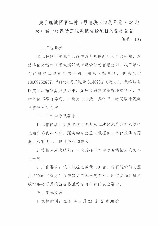 ¹ØÓÚ¹³ÇÇøÀè¶þ´å5ºÅµØ¿é£¨ºéµîµ¥Î»E-04µØ¿é£©³ÇÖдåˢй¤³ÌÄཬÔËÊäÏîÄ¿µÄ¾º±êͨ¸æ