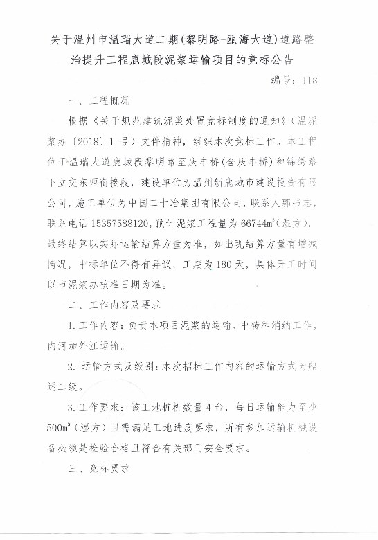 ¹ØÓÚÎÂÖÝÊÐÎÂÈð´óµÀ¶þÆÚ£¨ÀèÃ÷·-걺£´óµÀ£©õè¾¶ÕûÖÎÌáÉý¹¤³Ì¹³Ç¶ÎÄཬÔËÊäÏîÄ¿µÄ¾º±êͨ¸æ